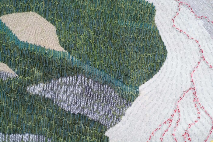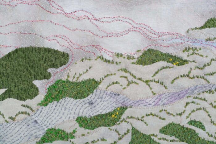 Alluvium Bettina MatzkuhnVancouver, British Columbia Vote Vote for AlluviumBettina Matzkuhn You can change your vote at any time before 5pm PST on October 17, 2025 Enter a valid email address to confirm your vote Email address Confirm vote Size 26" x 44" Medium Hand embroidery on linen The living landscape constantly transforms. Alluvial fans formed by silt carried by creeks are veined with capillaries that feed into arterial rivers. The spillage and circulation of water and earth erode and deposit in turn. Through slow, handsewn embroidery, I aim to capture this process. My work evokes the tactile nature of the landscape and personal encounters with place. Signs of climate change – from overt to subtle –show in leaves turning colour earlier in the season and patches of dead trees from spruce beetle kill. These relentless changes make me feel anxious. Buy artwork Alluvium Bettina MatzkuhnVancouver, British Columbia Vote Vote for AlluviumBettina Matzkuhn Enter a valid email address to confirm your vote Email address Confirm vote Buy artwork About the artist About the artist Bettina MatzkuhnVancouver, British Columbia Bettina Matzkuhn explores themes of ecology, weather, and geography in her fibre work. Addressing nature through the opulence of hand embroidery, she values the versatile language of textiles. Matzkuhn holds a BFA and an MA from Simon Fraser University and is the recipient of Canada Council and British Columbia Arts Council Grants. She has exhibited across Canada, as well as in Korea, Mexico, and the USA. Her work is found in national public collections such as the Surrey Art Gallery, Cambridge Art Gallery, and the Weldon Map Library at Western University. She lives and works in Vancouver, British Columbia. Follow on social