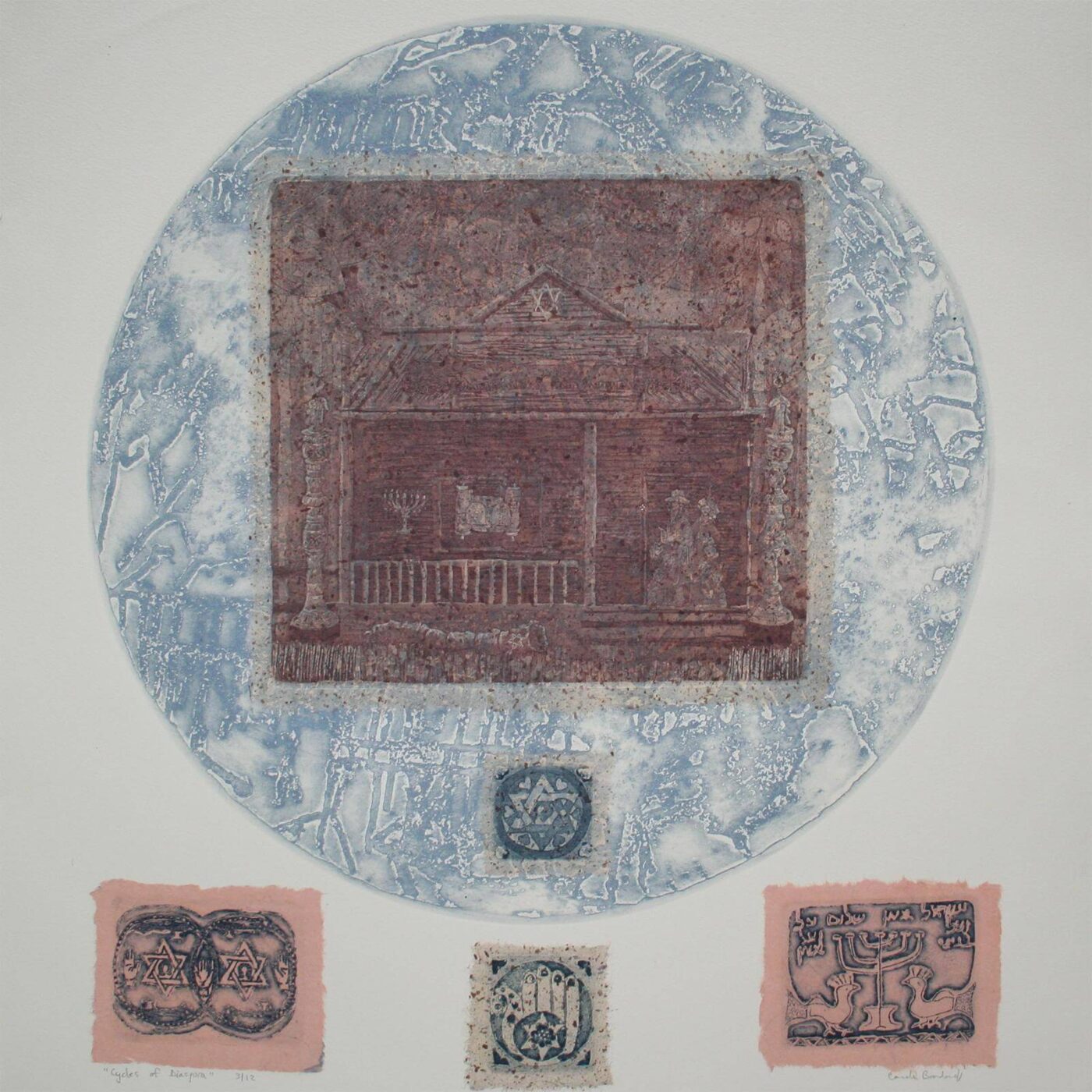 Cycles of Diaspora Carole BondaroffGaliano Island, BC Size 21.5" x 18.5" Medium Intaglio etching with chine collé and embroidery Escaping the pogroms of Czarist Oppression, my family, as refugees, sought a sense of belonging on the Canadian Prairies, where they could express their religious devotion in relative security, free from overt discrimination. A communally built synagogue, the central image of this art piece, is super-imposed over a deep embossed symbol of the globe. My printmaking methodology has evolved over the decades, including experimentation with embroidery and Chine Collé appliqué (Japanese Washi paper.) Interspersed are various iconic images, combined on this multi-plate intaglio etching, which refer to religious items, fundamentally important to Jewish tradition. Cycles of Diaspora Carole BondaroffGaliano Island, BC About the artist About the artist Carole BondaroffGaliano Island, BC Carole Bondaroff born in Montréal, Québec. Attended Sir George Williams University and Nova Scotia College of Art and Design. Earned a BFA in Printmaking and a BA in Art Education. She resides on Galiano Island, where she is an active member of the arts community and co-proprietor of Heart Studio West. She taught art at the University of Calgary, Alberta College of Art, Glenbow Museum, and as Artist in Residence with the Alberta Foundation for the Arts since 1986. Her works can be found in private and corporate collections, nationally and internationally, including the Royal Palace in Monaco, the Calgary Consul General of Japan, the Alberta Foundation for the Arts, the Canada Council Art Bank in Ottawa and la Bibliothèque de Québec, in Montréal. Follow on social