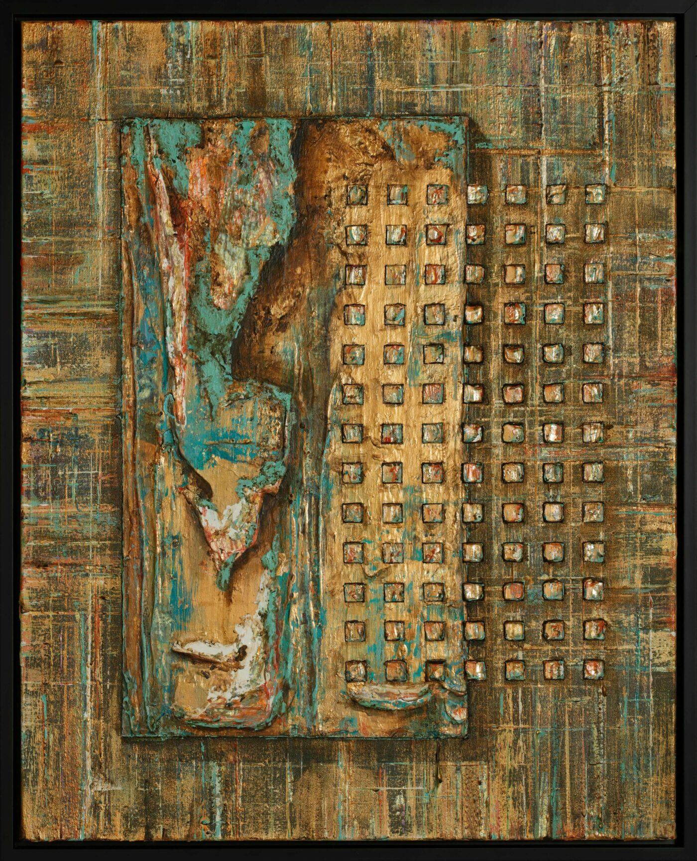 Fractured Faultlines Sally BornSalt Spring Island, BC Size 30" x 24" Medium Acrylic, plaster, gold leaf on canvas ‘Fractured Faultlines’ emphasizes beauty found in disruption and depth. Fractured layers reveal a multi-coloured core, rich with a rare, historical quality. Textured embellishments highlight the oxidation process, giving the surface an aged elemental feel. Organic and structured shapes are playfully juxtaposed, creating visual tension that emphasizes the balance between chaos and order. This work invites reflection on what lies beneath – where fragmentation reveals not weakness, but transformation. Fractured Faultlines Sally BornSalt Spring Island, BC About the artist About the artist Sally BornSalt Spring Island, BC Sally Born is a Canadian artist whose multidisciplinary practice spans painting, sculpture, and mixed media. With a B.A. in Art Education and a B.A. in Sculpture and Metalsmithing from Western Washington University, she has painted for over 40 years. Working with varied materials—from acrylic and oil paints to metal, glass and foils—she draws inspiration from everyday objects and the rituals of her creative life. Contemporary graphic shapes contrasting with organic forms embodies a shift in focus. In Fractured Faultlines, Born combines textured surfaces, metal accents and rich colour layers to explore the patterns and forces of the natural world. Follow on social