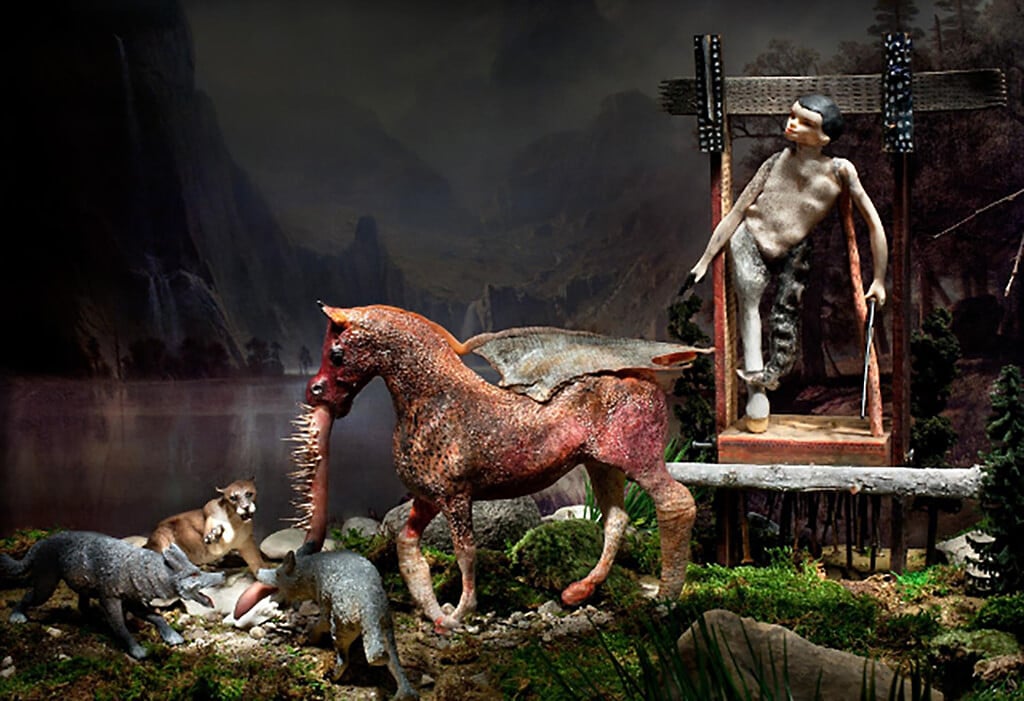 Guard on the Edge (of the forest and the night). Diana ThorneycroftWinnipeg, MB Juror's Choice Award Size 40" x 54" x 54" Medium mixed media The guard is part of a tribe of mutant herdsmen who are responsible for taking care of a herd of horses, half of which are equally transformed. Along with their caregivers, the altered horses are damaged, abject and vulnerable, and epitomize the grotesque. The unfolding narrative is purposely enigmatic. Juror's Choice Award Guard on the Edge (of the forest and the night). Diana ThorneycroftWinnipeg, MB About the artist About the artist Diana ThorneycroftWinnipeg, MB Diana Thorneycroft is a Winnipeg artist who has exhibited various bodies of work across Canada, the United States and Europe, as well as in Moscow, Tokyo and Sydney. She is the recipient of numerous awards including the 2016 Manitoba Arts Award of Distinction, an Assistance to Visual Arts Long-term Grant from the Canada Council, several grants from the Manitoba Arts Council and a Fleck Fellowship from the Banff Centre for the Arts. Thorneycroft taught as a sessional instructor at the University of Manitoba's School of Art for 25 years. Since 2010 she has been focusing on her studio practice full-time, and has gallery representation in Canada, the US and Europe. In 2013, Thorneycroft began working on a touring exhibition entitled Herd. A major component of the installation is the presentation of 150 plastic toy horses, half of which have been altered, travelling up a 40 foot ramp covered with snow. Follow on social
