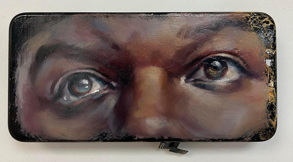 SM March 14, 2023 Zoey ZoricToronto, ON Size 11" x 14" Medium Oil paint on reclaimed iPhone screen In my artistic practice, I explore the interplay between technology, human connection, and the transient nature of our modern society. My current series focuses on oil paint portraits created on discarded and damaged iPhone screens, with an emphasis on capturing the intricacies and depth of people’s eyes. With a focus on the eyes, I invite viewers to engage in a deep and intimate connection with the subjects. The discarded and damaged iPhone screens symbolize the transitory nature of technology, while the timeless medium of oil paint represents the enduring essence of human expression. SM March 14, 2023 Zoey ZoricToronto, ON About the artist About the artist Zoey ZoricToronto, ON Zoey’s current body of work explores the entanglement between technology and human relationships. The discarded and damaged iPhone screens symbolize the transitory nature of technology, while the timeless medium of oil paint represents the enduring essence of human expression. After an accomplished career in computer animation and digital painting, Zoey moved towards a more traditional practice, oil painting. Zoey studied under contemporary masters such as Keita Morimoto, Max Ginsburg, Costa Dvorezky, and Scott Conary. She now shares her extensive artistic knowledge with her students at Centennial College while maintaining an active practice out of her studio, Studio 102, in North York, Ontario. Follow on social
