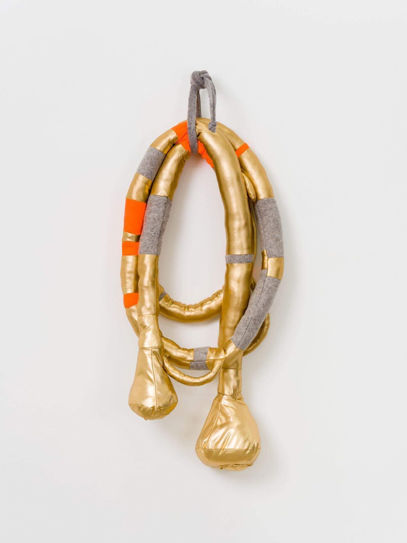 Soft Talk Quiet Listening Maria HupfieldToronto, Ontario Size 36" x 15" Medium Industrial felt, gold spandex, fabric This soft sculpture is wall mounted and styled after a listening device like a tin can phone from childhood with two receptors at either end of a long rope. I design my creations to be worn by and in relation to the body. As a performance artist I am interested in new narratives where artwork is an invitation for the unexpected. This work comes out of my commitment to communication and deep listening both internally with self and externally with others as written about by Indigenous scholar Dylan Robinson in “Hungry Listening”. Soft Talk Quiet Listening Maria HupfieldToronto, Ontario About the artist About the artist Maria HupfieldToronto, Ontario Maria Hupfield merges performance art, design, and sculpture; drawing from Indigenous storytelling traditions through art, scholarship, collaboration, and social justice. Recent accomplishments include: Eiteljorg Contemporary Art Fellowship 2025; and “The Endless Supernatural Powers of Fabulous Panther (Biimskojiwan)”, Wexner Center for the Arts (Columbus, Ohio, USA) 2025, following its premiere at the Toronto Biennial of Art 2024. Hupfield is Anishinaabek, Wasauksing First Nation (Huron Robinson Treaty), an island in Georgian Bay, Ontario, Canada; and the Canadian Research Chair in Transdisciplinary Indigenous Arts, Associate Professor in Indigenous Digital Arts and Performance, and Director of Indigenous Creation Studio, at the University of Toronto. Follow on social