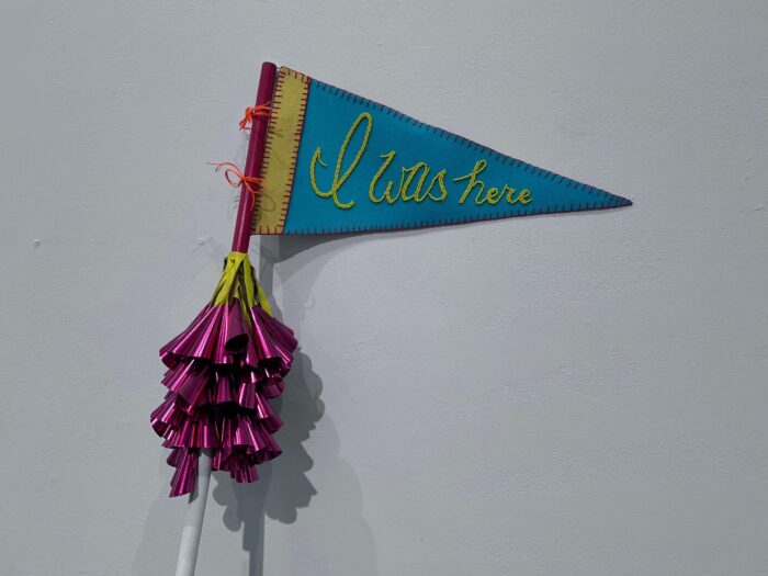 Beadwork is a trace of its maker, a physical tie to this world after someone has left it. This flag embodies this as it stands at 6 feet 2 inches, the same height as me. I made it brightly coloured to feel more like a celebration of life rather than commemoration of death. Its installation is a simple lean against the gallery wall, alluding to the body at rest. The presence of jingles gives the sense that this object has been performed before being put down, much like how life is a flurry of activity before rest.