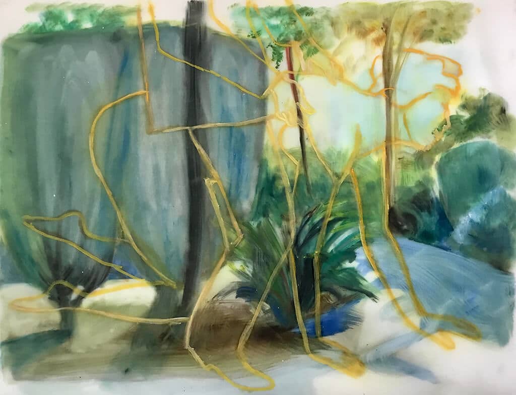 The Garden Stefanie DenzSalt Spring Island, BC Size 15.5" x 20" Medium Oil on plastic Superimposed on the glowing foliage of a garden are two figures. They are pale on the soft plastic surface, and the rider holds her straps lightly as they edge forward. There is no force; rather, the compromised position is that of the theatre of the absurd. With hands and knees on the ground, she has an embodied understanding of where she is and how they might move through the undergrowth. Society can be like gardens, with paths, chosen plants, prunings, and seasonal changes shaping our movement. However, I do think we know that what has been removed is still part of us. It is irrational, grounding, and knowing. The Garden Stefanie DenzSalt Spring Island, BC About the artist About the artist Stefanie DenzSalt Spring Island, BC Stefanie Denz, MFA, University of Auckland (Commonwealth Scholarship 1989), is a recipient of Canada Council awards, and BC Arts Council and Salt Spring Arts Council grants. She has exhibited and is in private collections in New Zealand, Germany, USA, and Canada. Stefanie attended residencies in Berlin in 2013 and 2014 (Transart Institute). In 2020, she completed Art Therapy certification at Vancouver Art Therapy Institute. Stefanie includes a variety of materials in her paintings besides using traditional substrates. Her subject matter explores relationships within the composition and how that shapes the narrative. She paints her surroundings: family and friends, movie stills, media sources, architecture, dreams, and daily life. Stefanie’s work is spatial, concerned with context and how we find ourselves where we are. Stefanie lives on Salt Spring Island, BC. Follow on social