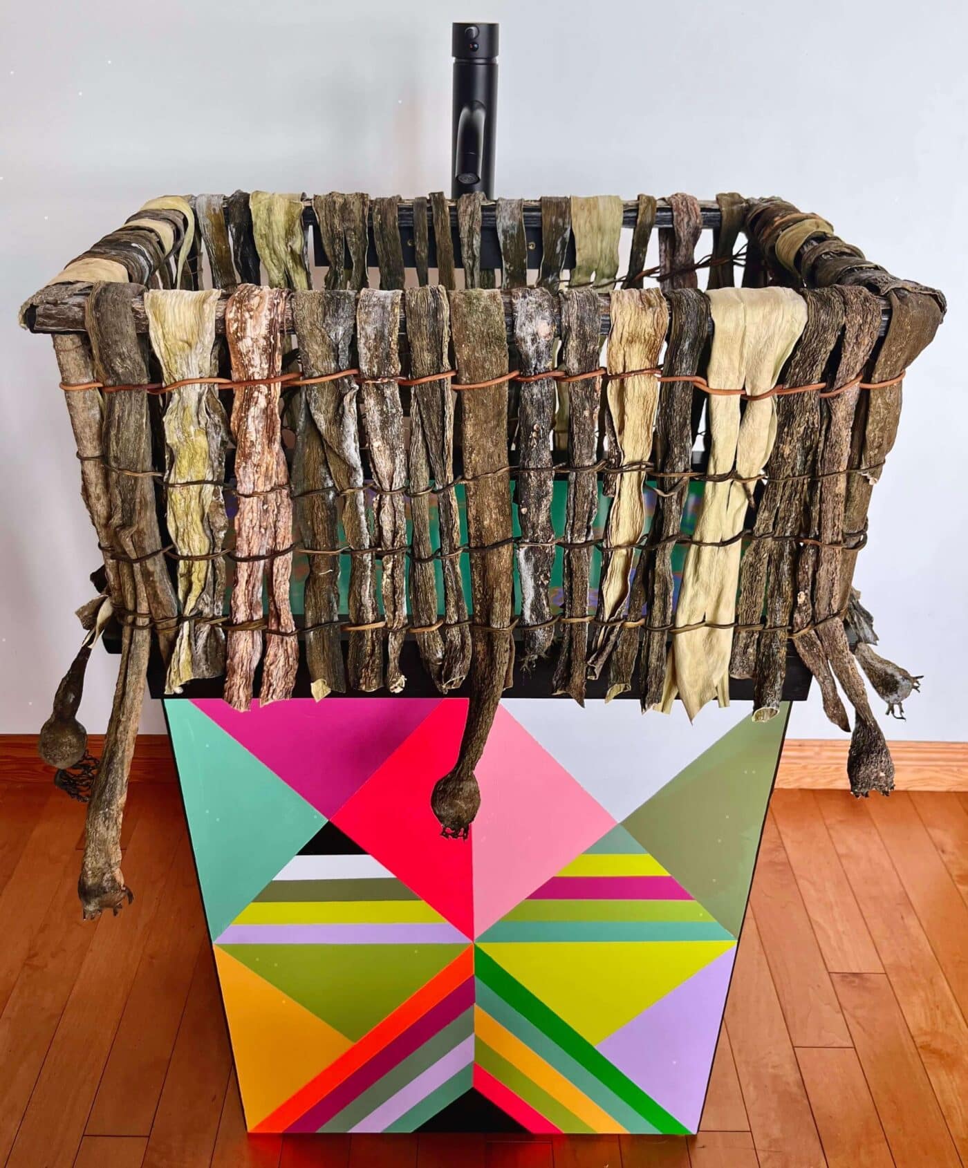 Carbon Sink Jennifer MaksymetzSalt Spring Island, BC Dimension 47" x 25" x 16" Médium Nereocystis luetkeana, digital video, audio, plywood and acrylic A multidisciplinary sculpture that merges weaving, video, and sound design to highlight the vital role of kelp forests in climate mitigation and oceanic health. At the heart of the installation is a woven ‘sink’ made from locally handharvested kelp, recalling both the resilience and fragility of coastal life. A vivid moving image sequence guides viewers through Pacific Northwest kelp forests, using colour and rhythm to evoke wonder and focus attention. A headphonebased audio experience blends hydrophone recordings and bio-sonification into a rich, atmospheric soundscape that makes the hidden life of kelp ecosystems audible. Carbon Sink proposes that interdisciplinary collaboration—between artists and ecologists—can spark. Carbon Sink Jennifer MaksymetzSalt Spring Island, BC À propos de l'artiste À propos de l'artiste Jennifer MaksymetzSalt Spring Island, BC Biography: Jennifer Masksymetz Jennifer is an artist, curator, researcher and ritualist whose work hones in on the transformative power of art for social reflection. Biography: Matt Robertson Matt Robertson, a British-born, Canadian-based, 3x Grammy-nominated composer, producer, and musical director. He has worked with artists including Björk, Anohni, Arca, The Cinematic Orchestra, and Ellie Goulding as musical director, orchestrator, and arranger. He has released four solo albums, blending ambient sound design with warm techno textures and delicate electronics. Influenced early by Jean-Michel Jarre and Jimmy Smith, Matt studied at the University of Surrey before working in London studios, where he began building his own synths. Drawing on vintage, modern, and DIY instruments, he merges electronic production with classical composition and cinematic soundscapes. His distinct sound has earned wide acclaim, two Grammy nominations for work with Anoushka Shankar, and recent film scores including Navalny and The New Corporation. Biography: Joan Carrigan Joan Carrigan has been exploring a diverse range of basketry techniques and materials for over 30 years. After studying Fine Art and Art History at the University of Guelph she attended her first Basketry Conference in Toronto in 1991. Her research into traditional skills inspires her use of the plant materials she respectfully harvests from nature, while her background in fine art fuels her enthusiasm for the sculptural and creative potential that the medium offers. Joan’s work has been exhibited nationally and internationally. Joan teaches extensively and finds this to be a very rewarding aspect of her life as a basketmaker. Biography: Siobhan Gray Born on Toronto island and living life in Bamfield, west coast Vancouver island, never far from the waters edge. Jeweller, artist, designer, professional scientific diver and poet. Forever inspired by nature, Creating art for the strong and the good. “imagine the falling rain loves you” Biography: Tarun Nayar Tarun Nayar of Modern Biology, is a biologist-turned-musician trained from childhood in Indian classical music. He creates immersive soundscapes by blending raga traditions with modular synthesis, custom-built instruments, and the natural vibrations of plants, electromagnetic fields, and even the earth’s resonant hum. His performances transform bioelectricity and environmental resonance into deeply contextual music that invites listeners into the present moment through vibration, space, and connection. Suivez sur les sociaux
