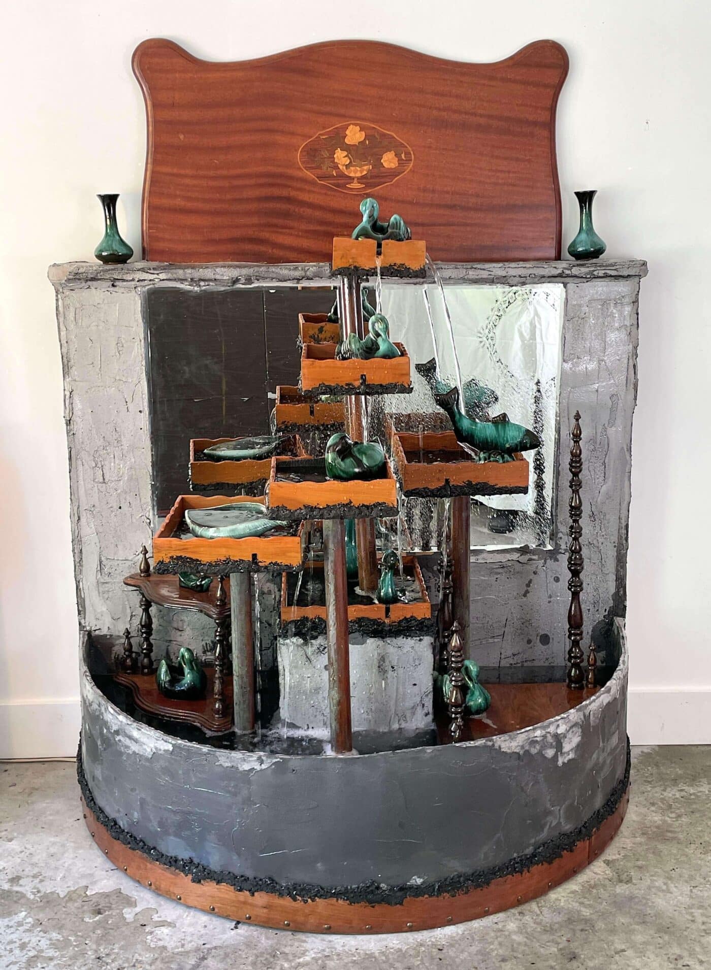 flow state Amy JonesSalt Spring Island, BC Dimension 65" x 50.5" x 27" Médium Assemblage objects, water, pond pump, concrete, epoxy, mirror, headboard, resin Flow state is a meditation on the environment in a time of crisis. Water, essential to life: its beauty and its power to destroy. This piece is an elaborate frame made of upcycled materials including the rubble of a fire. Within is a tribute to Jozo Weider’s Blue Mountain Pottery. Established in Ontario in 1953 this no longer produced flow glaze pottery was an identifiably Canadian export. The design and structure of this fountain evolved around the question of sustainability. I am inspired by Nancy Holt and Louise Nevelson to use found objects and let materials dictate their own limits. flow state Amy JonesSalt Spring Island, BC À propos de l'artiste À propos de l'artiste Amy JonesSalt Spring Island, BC Amy Jones has returned to making art in a studio setting after three decades teaching full-time in BC’s public education system. A graduate of Emily Carr University, participant in the Whitney Museum Independent Study Program and recipient of a few awards and grants, Amy has recently retired from teaching to concentrate on making sculpture. Her life on Salt Spring Island included opening and co-owning Fault Line Projects Gallery with her partner Nigel Harrison.