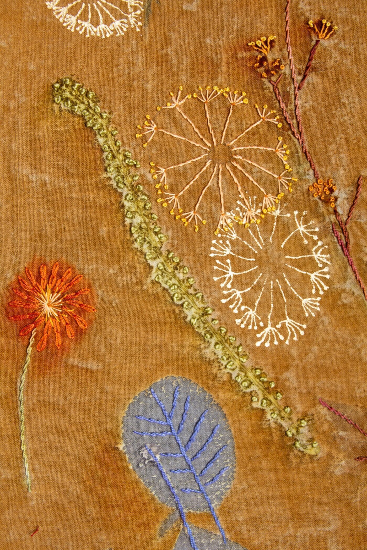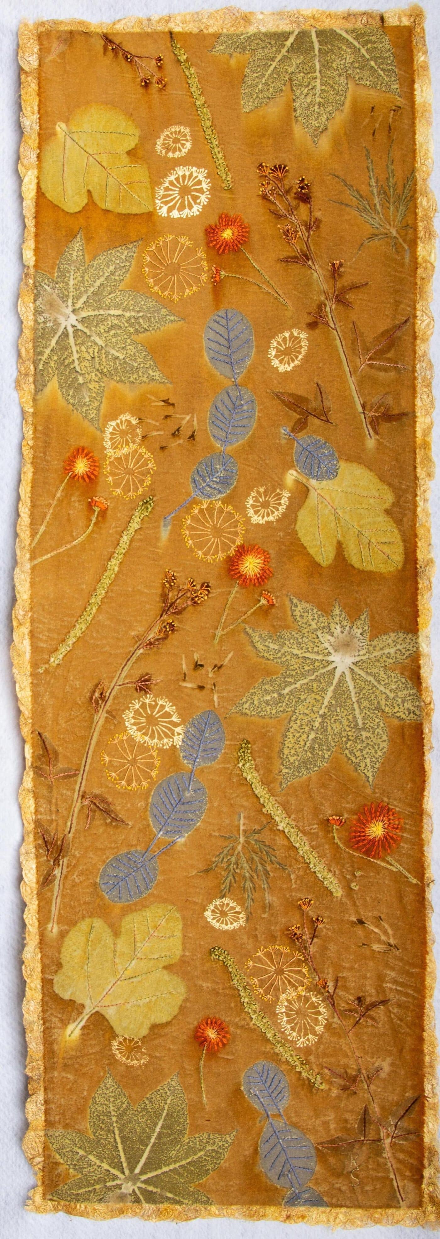 Glow Before Twilight Karen SelkSalt Spring Island, BC Dimension 51" x 17" Médium Natural juices released from plants using minerals and steam make the prints on silk cloth. Embellish with silk fibre, thread and cocoons. Walks with my father through woodlands and growing vegetables together, instilled a deep connection with the plant world. Through botanical printing I share the beauty, science and magic of plants. Eri silk fabric is treated with natural minerals and tannins before arranging botanicals on its surface. The bundle is rolled around a dowel, bound with a cord and steamed, coaxing the release of plants natural pigments, creating a light fast print. Each print serves as a tribute to the diversity of plant life, emphasizing their vital role in our existence, for without them we would not exist. Embellished with hand stitching. Glow Before Twilight Karen SelkSalt Spring Island, BC À propos de l'artiste À propos de l'artiste Karen SelkSalt Spring Island, BC Karen Selk is a textile artist, writer, educator and entrepreneur with a lifelong passion for silk. For over 35 years, she has studied wild silk traditions in India, culminated in her book: In Search of Wild Silk: Exploring a Village Industry in the Jungles of India. Over the course of her career, she has shared her expertise worldwide through workshops, lectures, videos and numerous articles in textile magazines. Her work has been featured in international exhibitions and is represented at Gallery 8. Karen lives on Salt Spring Island where the natural beauty inspires her art, writing and organic gardening. Suivez sur les sociaux