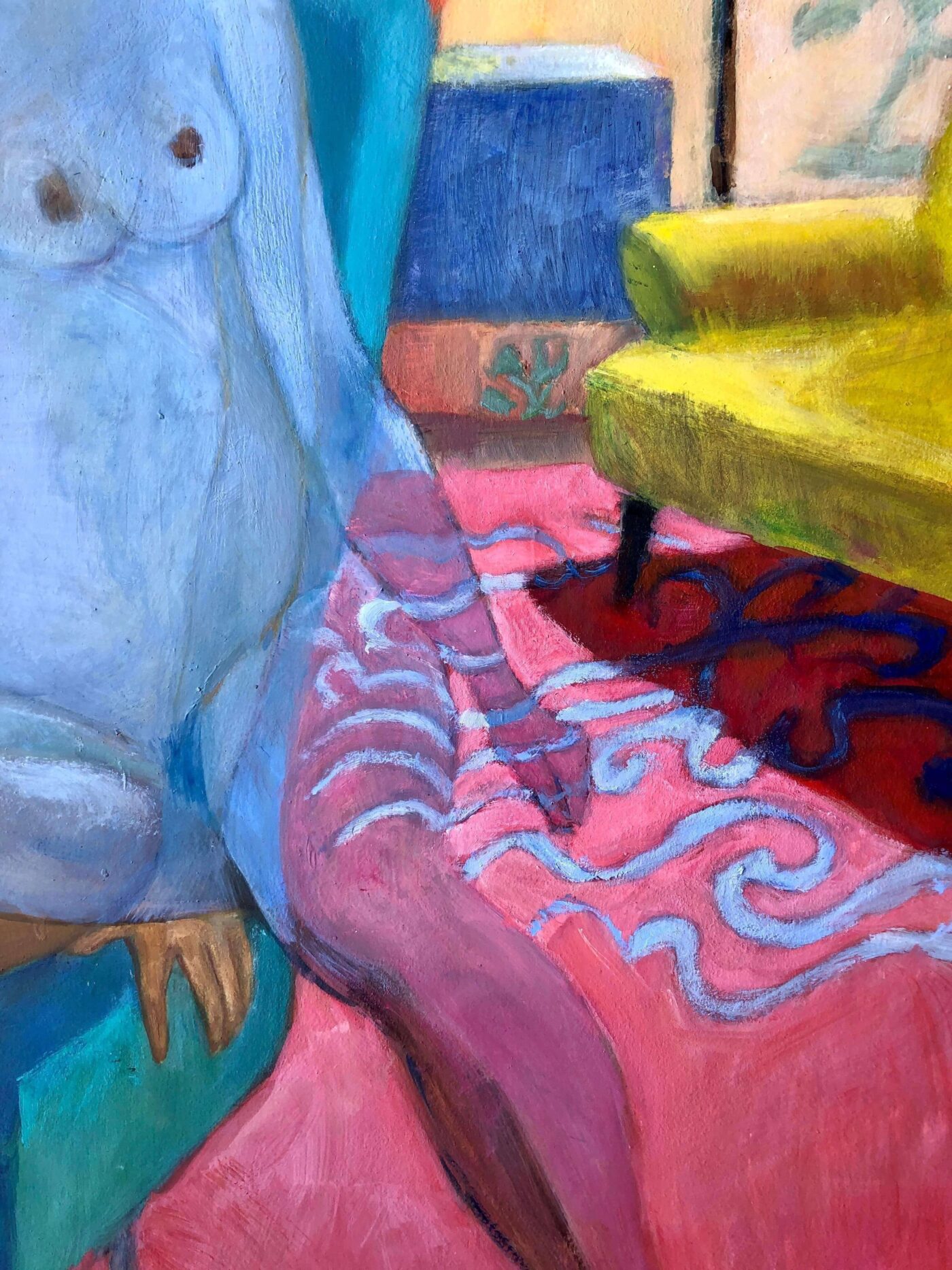 In the Foreground – Towards Edges of Flow Stefanie DenzSalt Spring Island, BC Dimension 40" x 48" Médium Oil on maple panel The model’s pose is based on a Balthus’ painting ‘The Window’. Though caught by the camera, Bronwen’s eyes move to look at pregnant Metta and her larger self-taking up the foreground. I wanted to know more about Alex’ fascination with the pose, and somehow, my understanding of pregnancy and how it changes the world is part of that. Trees dance on the walls, the carpet swirls onto the blending bodies of Metta and her larger version, and the bevy of movement pushes at the finite edges of shapes and the historical, psychic and social connections they signify. Amongst the jostle are other meanings and tolerable freedom. In the Foreground – Towards Edges of Flow Stefanie DenzSalt Spring Island, BC À propos de l'artiste À propos de l'artiste Stefanie DenzSalt Spring Island, BC Stefanie Denz maintains a home and studio on Saltspring Island BC, grateful to live on the un-ceded territories of the Coast Salish peoples. She is an educator and art therapist and recently began her PhD studies in Creative Research. Stefanie attended artist residencies in Berlin, Germany in 2013 and 2014 and has received grants from the Canada Arts Council (1999 & 2003), BC Arts Council (2009), Saltspring Arts Council (2010) and other organizations. Stefanie’s work is in numerous private collections. Her work can be seen at Rhubarb Design, Ganges as well as in her studio, and she is represented by the Elliott Louis Gallery in Vancouver. Suivez sur les sociaux
