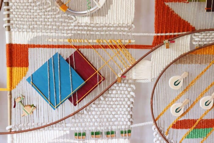 Textile assemblage sculpture on mixed yarns and salvaged piano parts