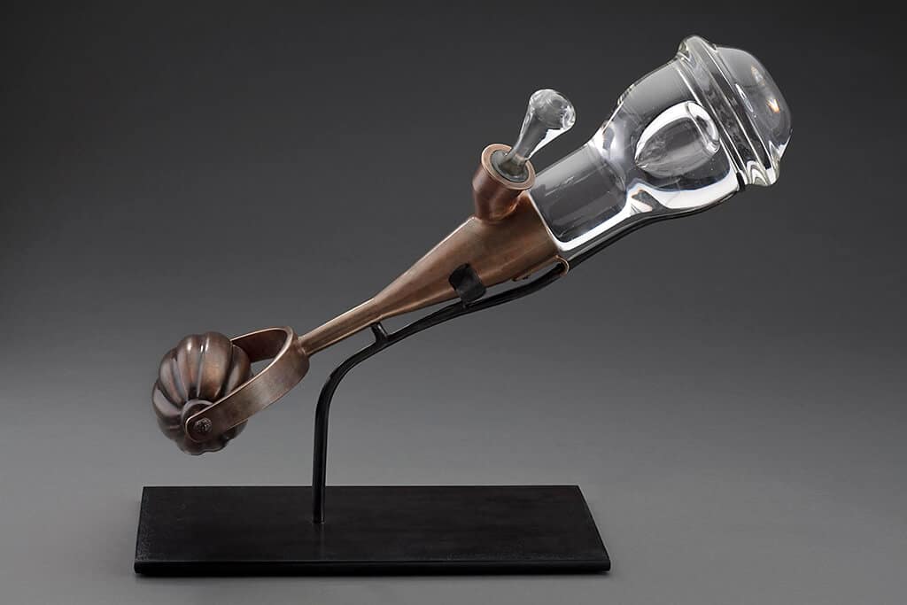 Tracing Wheel Lou LynnWinlaw, BC Dimension 15" x 20" x 7" Médium Bronze & Glass “Tracing Wheel” is an interpretation of a tool that is used to copy patterns onto fabric. The resulting object takes a serious departure from function; while making an implied reference to a functional implement, it offers only an impractical solution for imagined tasks. Tracing Wheel Lou LynnWinlaw, BC À propos de l'artiste À propos de l'artiste Lou LynnWinlaw, BC Lou Lynn attributes her interest in glass as a sculptural medium to frequent periods of study at the renowned Pilchuck Glass School. Inspiration for Lynn’s work has been drawn from archaeological artifacts, old implements, objects, and tools. She combines the fragility, strength and optical properties of glass with bronze, to create contemporary forms that involve a juxtaposition of contrasting materials and express the tension that exists between strength and fragility. Lynn’s sculptures are in numerous public collections including Canadian Museum of Civilization, Canadian Clay & Glass Gallery, Montreal Museum of Fine Arts, Berlin Embassy Collection, Glasmuseum, Ebeltoft, Denmark, Kamloops Art Gallery, Xerox of Canada Collection and the Corning Museum of Glass, NY. Lynn has been the recipient of grants from the BC Arts Council, Columbia Kootenay Cultural Alliance, Vancouver Foundation, and the Canada Council. In 2010 she was inducted into the Royal Canadian Academy of Arts (RCA). Suivez sur les sociaux