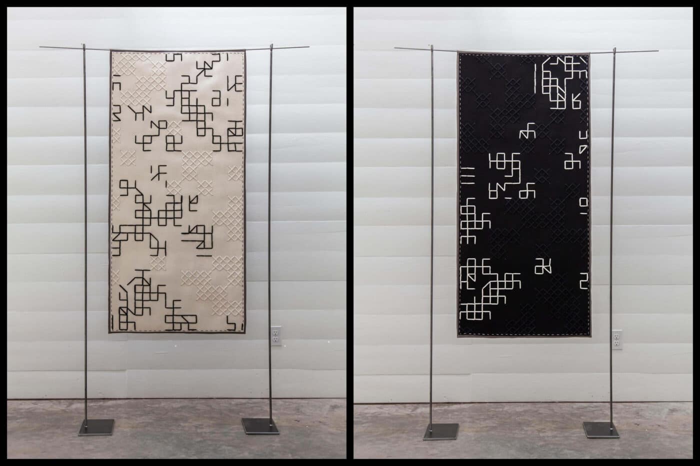 What George Said… Anna GustafsonSalt Spring Island, British Columbia Prix Salt Spring - Prix Joan McConnell Dimension 80 x 54 x 10 Médium Cotton yarn on wool felt Salt Spring Prize: The Joan McConnell Award $20,000 – Donated by Joan McConnell “Power is not a means; it is an end.” “Weakness is strength.” “The past was erased, the erasure was forgotten, the lie became the truth.” – George Orwell “Everything is coded now” “Whoever feels safe is more likely to use un-coded terms, say things straight out… …Language is just a reflection of reality.” – Robin Lakoff, UC, Berkeley, NYT, May 2025 White is black. Black is white. The imagery evolved from the cross-stitch sampler that Liberty, my mother, made as a child in the 1930s, with scrap yarn and fabric. Heavy thick felt was chosen to evoke visceral veritas. Prix Salt Spring - Prix Joan McConnell What George Said… Anna GustafsonSalt Spring Island, British Columbia À propos de l'artiste À propos de l'artiste Anna GustafsonSalt Spring Island, British Columbia Anna Gustafson was conceived in Guatemala to an Italian/Guatemalan mother and Swedish father, born in Sweden and raised in Vancouver, Canada. Gustafson's long view has benefited from being nurtured in a multi-cultural family within an immigrant perspective. An important premise of her work is that we best remember information and events through our senses and associated emotions. With a strong sensory component, her work is a catalyst for deep emotion and conversation, that encourages each viewer absorb and retain their experience. Anna has shown in public galleries since 1974. Anna acknowledges the support of the Canada Council for the Arts. Suivez sur les sociaux
