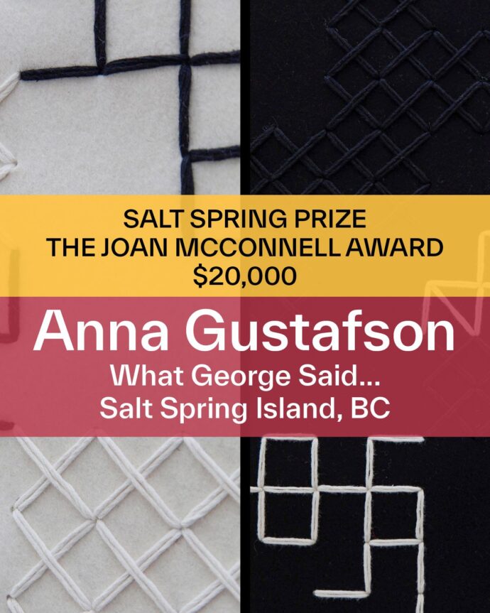 Oct 19, 2025 1 min read Anna Gustafson WINS THE 2025 SALT SPRING NATIONAL ART PRIZE FOR “What George Said…” Award-winning piece chosen from 52 finalists across Canada; $52,000 in prizes presented at Salt Spring gala. Salt Spring Island, BC — The Salt Spring National Art Prize (SSNAP) has announced Anna Gustafson of Salt Spring Island, BC as the winner of the 2025 Salt Spring National Art Prize for their work “What George Said…” a text-based fibre work reinterprets a 1930s cross-stitch sampler originally made by the artist’s mother.