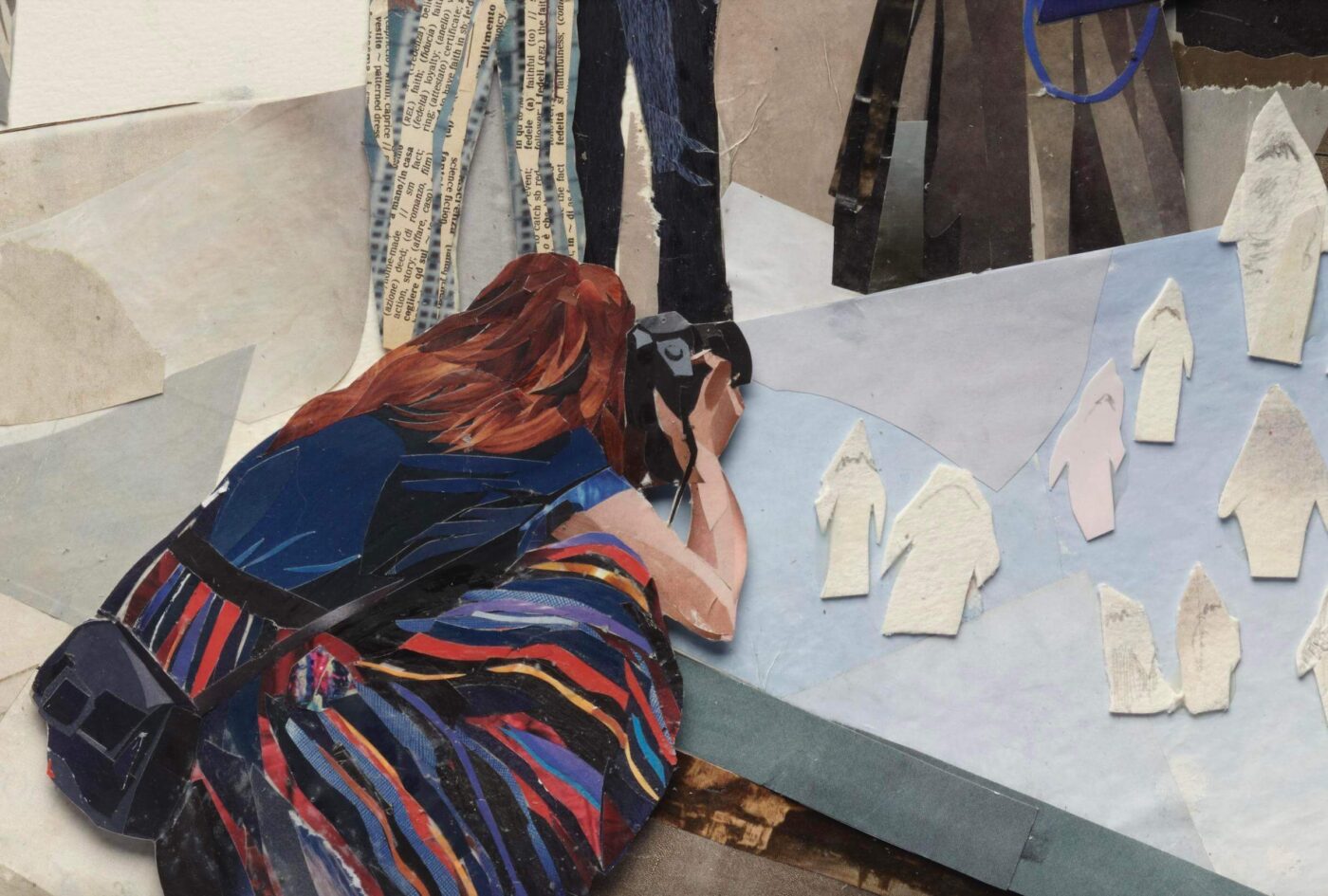 My interdisciplinary work addresses themes of place, memory, the quotidian, time and migration. I believe that the transience of my current subject matter is best reflected in the medium of collage. For, while our everyday rituals are as ubiquitous and consistent as the production and consumption of mass media (printed or digital), they are also precious or fleeting and perhaps, in many ways, miraculous. Here my photo-based collage, made of hundreds of cut paper fragments depicts a moment within the Venice Biennale. Bridging context and conversation, visitors flock here to experience a world within a world, within a world.